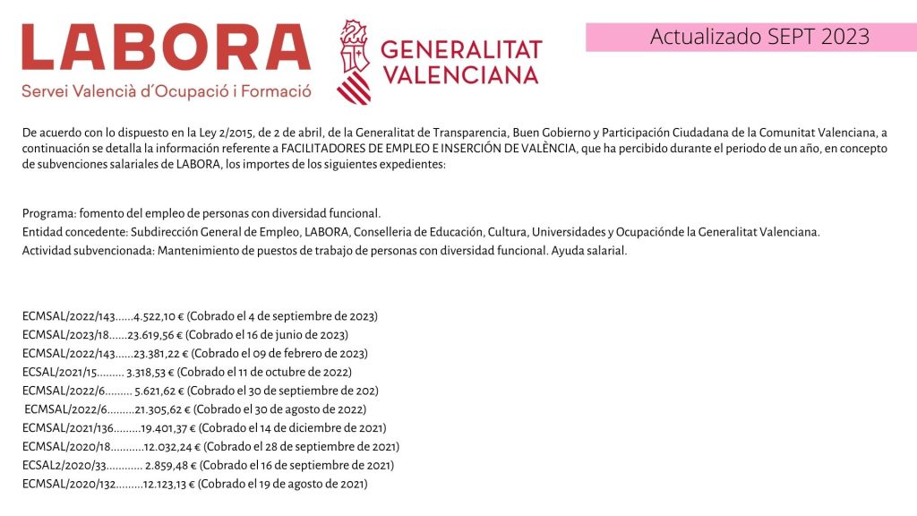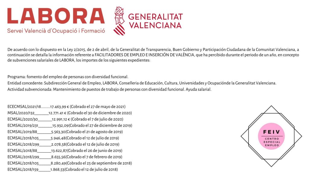 De acuerdo con lo dispuesto en la Ley 2/2015, de 2 de abril, de la Generalitat de Transparencia, Buen Gobierno y Participación Ciudadana de la Comunitat Valenciana, a continuación se detalla la información referente a FACILITADORES DE EMPLEO E INSERCIÓN – 3